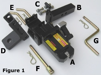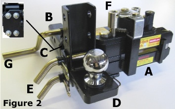 4. Attach the Ball Mount (D) to the end of the Main Body lower arm using the two Securing Pins (E). Secure with Clevis Pins as show in Figure 2. Note: The Ball Mount has a series of five adjustment holes that will permit different height settings depending on the height required for the towing vehicle.