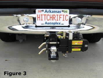 The Receiver Insert (B) should slide into any standard 2” receiver and secure with a hitch pin. The Ball Mount (D) height may be adjusted easily by removing the Securing Pins (E) and selecting different hole settings. In addition, optional extra ball mounts (D) are available for quick change of ball sizes or reverse mounting. Once secured to the vehicle, the HITCHRIFIC® REEL-QUIK HITCH and ball should be latched to the trailer’s coupler as any other ball mount. See Figure 3. Always be sure that the correct size ball is matched to the trailer being pulled.